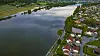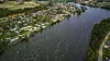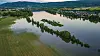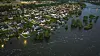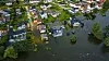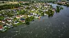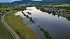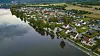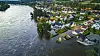 Dronebilder fra Drammenselva mellom Steinberg og Hellefossen med flomnivå på 3,15 meter ved Mjøndalen.