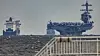 FRAKJØRT AV DANSKEBÅTEN: Her blir USS Gerald Ford passert av Colorline på vei ut ytre Oslofjord. Foran ligger KNM Roald Amundsen. Bildet er tatt fra Bastøfosen.FOTO: ALEXANDER JANSEN / DRM24
