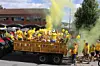 Det gule laget ankommer Hokksund med stor selvtillit og røykbombe. Kanskje de var sikre på seier allerede her?