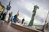 Markering ved statuene «Sjøen» og «By og land», de to velkjente damene som prydet den gamle brua og nå er avduket på den nye