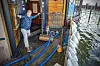 FLOMSIKRING: Februar har vært preget av mange flombilder. Her forsøker Bjørn Herstad å hindre vannmassene å trenge inn på Skutebrygga uten å bli våt på beina.FOTO: ALEXANDER JANSEN