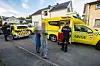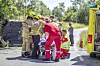 BILTYVERI GIKK GALT: Fem kilometer etter at bilen var stjålet, landet den på taket på Gallebergveien i Sande. Mannskapene fra nødetatene måtte kjempe for å få den kvinnelige biltyven inn i ambulansen. (FOTO: ALEXANDER JANSEN)