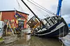 SISTE REIS: Seilskuta Marlin gikk til bunns utenfor Tangenkaia, her er den heist opp på kaia og avventer siste reis til skrothaugen. (FOTO: NILS J. MAUDAL)