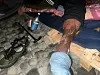 De har lagt seg til med papp og noen svært enkle skumgummimadrasser. En av mennene har fått tak i et par paller han har under en tynn madrass. Han forteller at han sliter med et skadet bein, og drar opp buksa. Her åpenbarer det seg noe som åpenbart tilsier et behov for medisinsk oppfølging.
