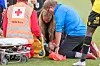 GA VIKTIG STØTTE: Her kommer Strømsgodset klubblege Erik Dag Knudsen for å gi assistanse da det ble klart at det kunne være snakk om alvorlige skader.
